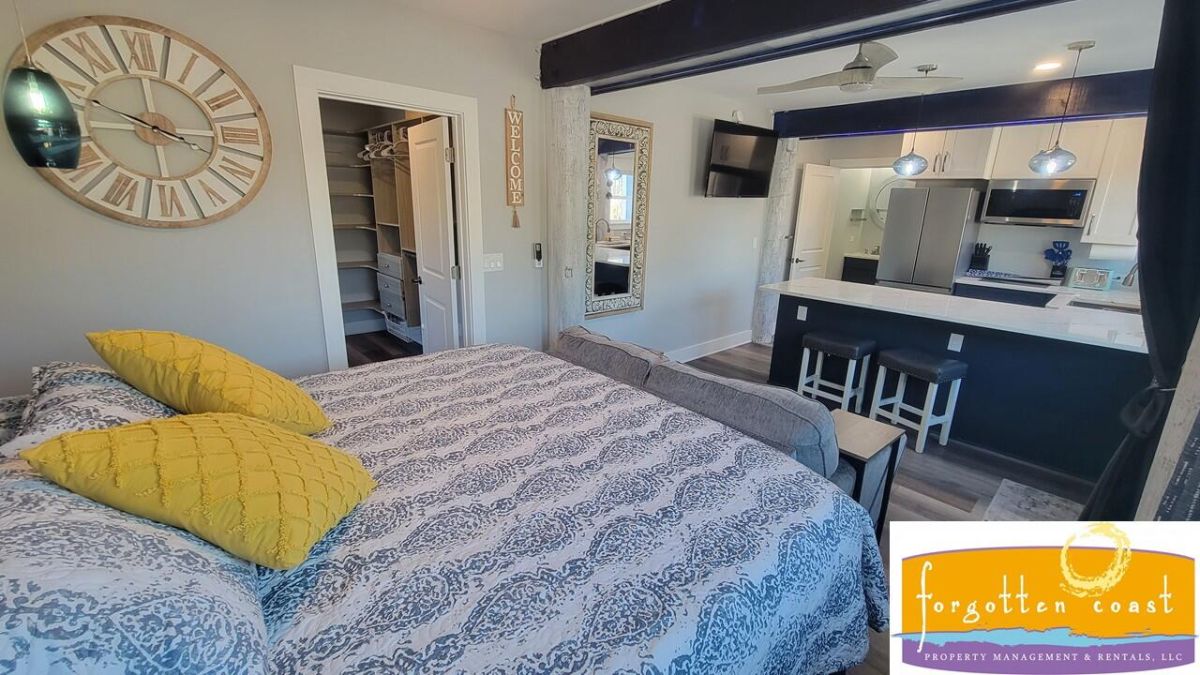 Blue Cove https://www.forgottencoastrental.com/vacation-rentals/rental/15856/ is a ground-level apartment with king bed, full kitchen, walk-in closet, full size W/D, private separate entrance, fully fenced patio, and outdoor dining area.
